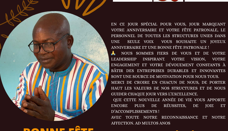 En ce jour spécial pour vous, jour marquant votre anniversaire et votre fête patronale, le personnel de toutes les structures unies dans une seule voix vous souhaitent un joyeux anniversaire et une bonne fête patronale ! 🙏 Nous sommes fiers de vous et de votre leadership inspirant. Votre vision, votre engagement et votre dévouement constants…